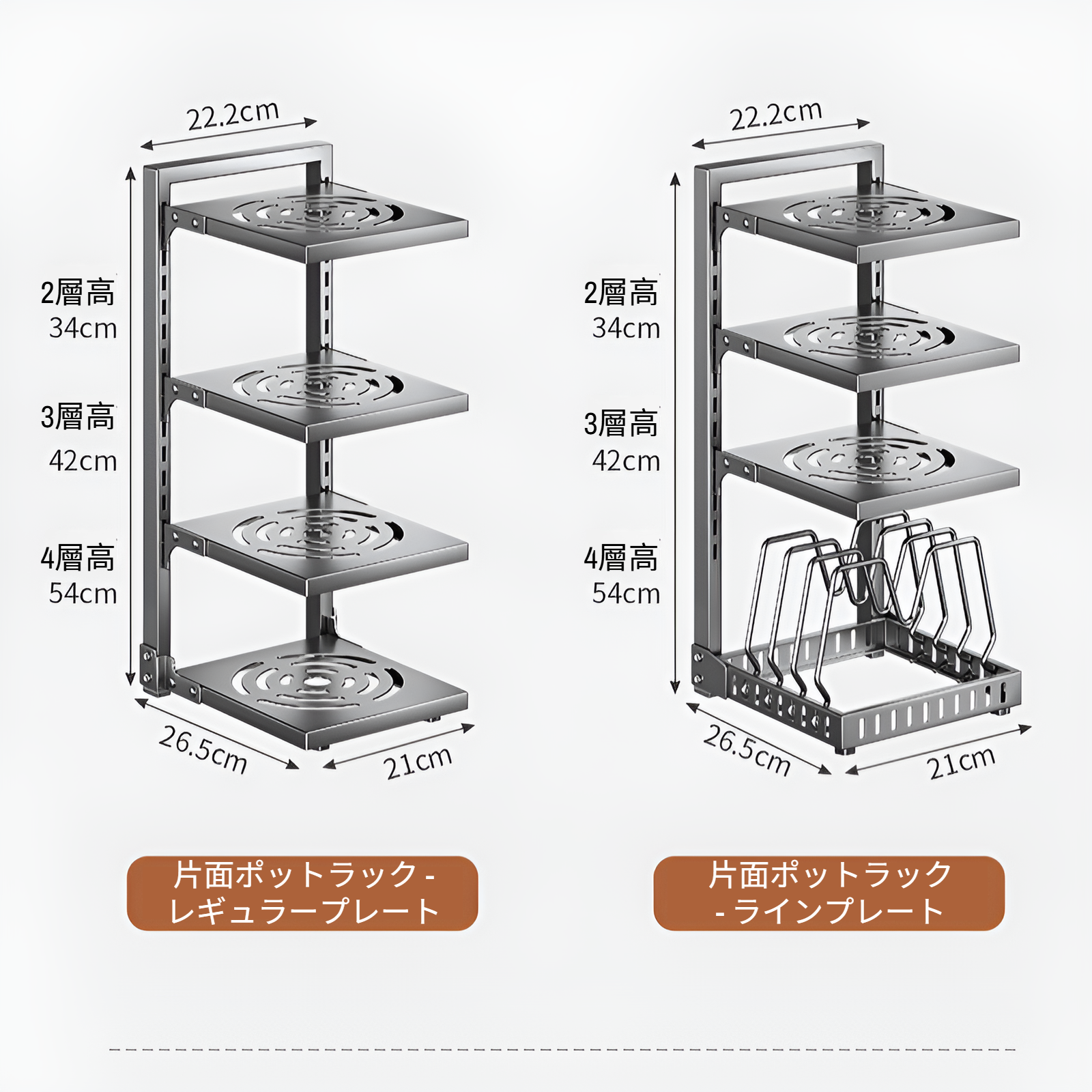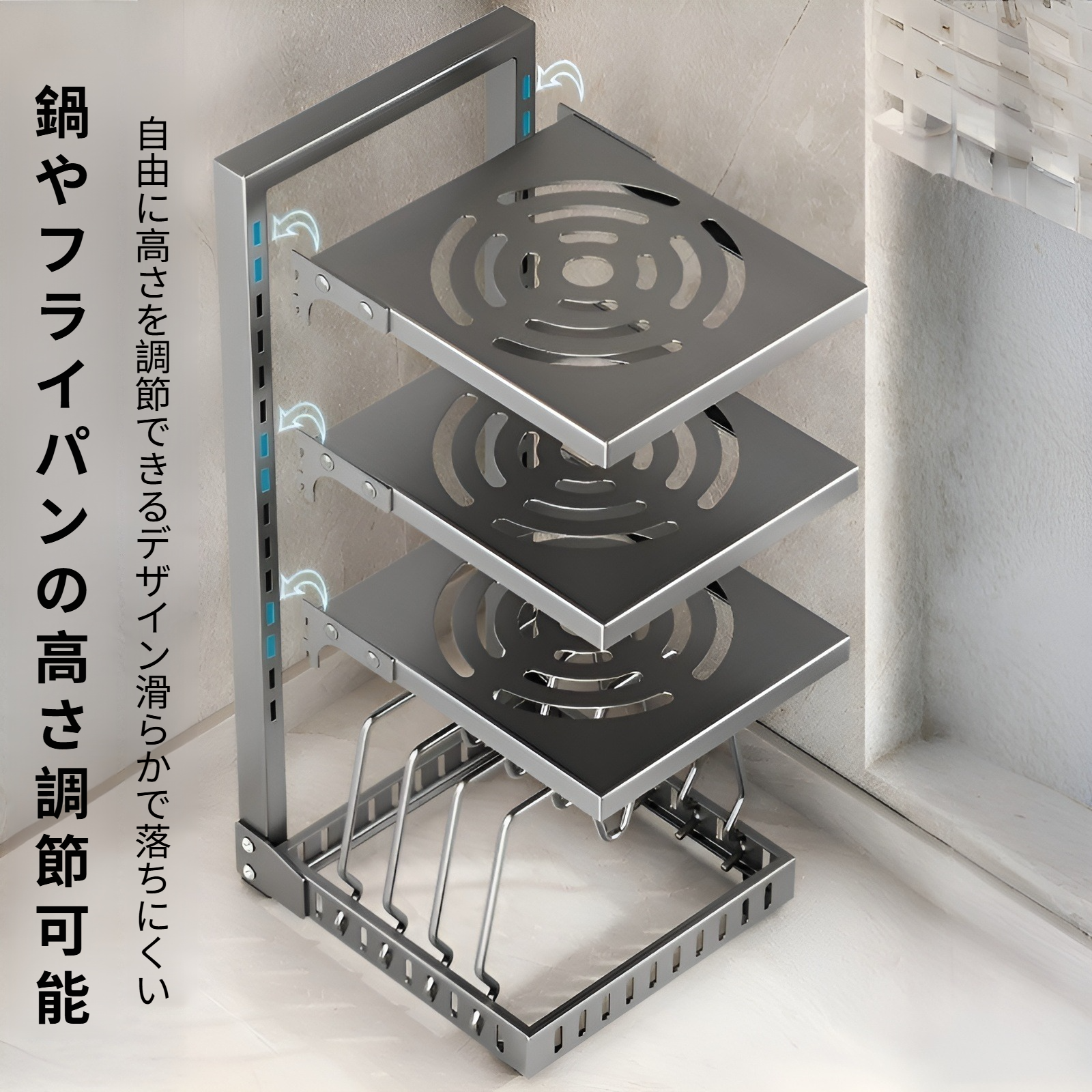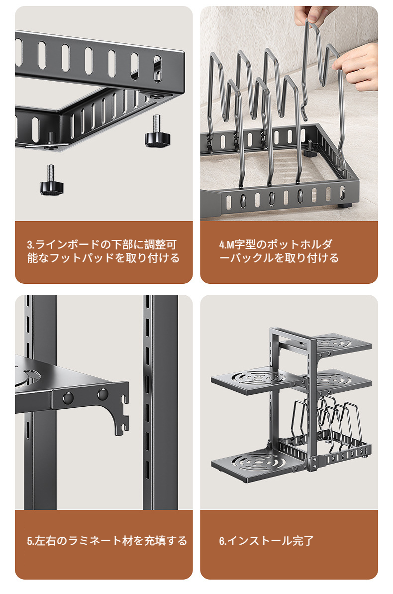 鍋蓋収納に便利な調節可能ラック